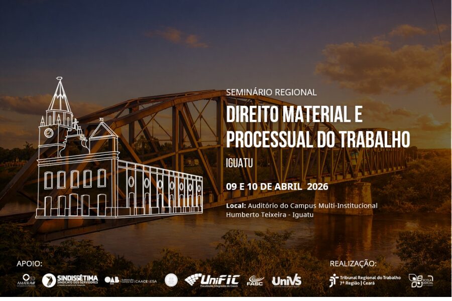 A Escola Judicial do Tribunal Regional do Trabalho da 7ª Região (CE) promoverá, nos dias 9 e 10 de abril de 2026, o Seminário Regional de Direito Material e Processual do Trabalho – Iguatu. O evento vai acontecer de modo presencial, no auditório do Campus Multi-Institucional Humberto Teixeira da Universidade Regional do Cariri (Urca), no município de Iguatu-CE.