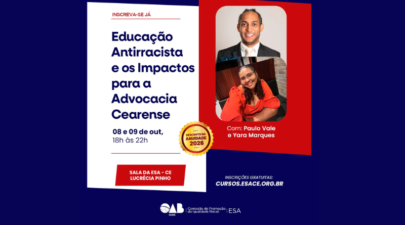 Nos dias 8 e 9 de outubro, a Comissão de Promoção da Igualdade Racial da OAB-CE, em parceria com a Escola Superior de Advocacia do Ceará (ESA-CE), realizará o evento “Educação Antirracista e os Impactos para a Advocacia Cearense”. A programação acontece de forma presencial, das 18h às 22h, na Sala Lucrécia Pinho, com inscrições gratuitas pelo site da ESA.